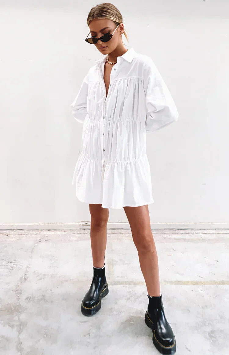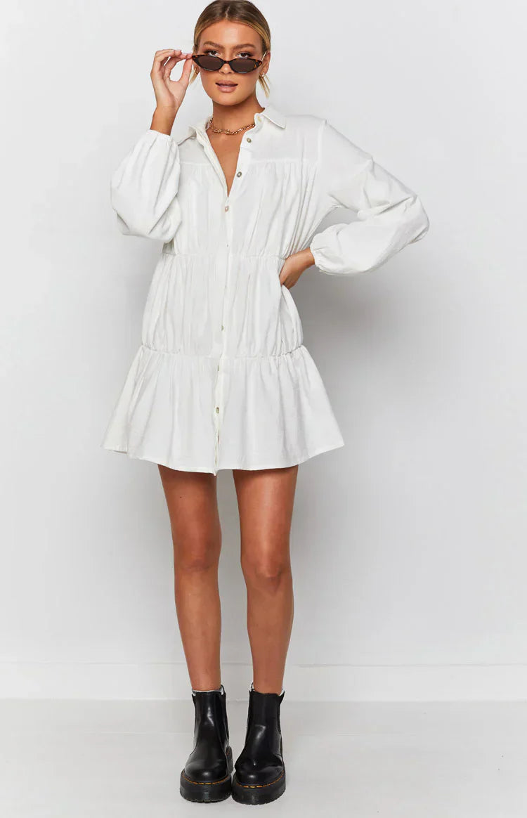 This white tiered long sleeve dress is perfect for cooler summer days – pair it with gold accessories and shoes of your choice depending on the occasion!