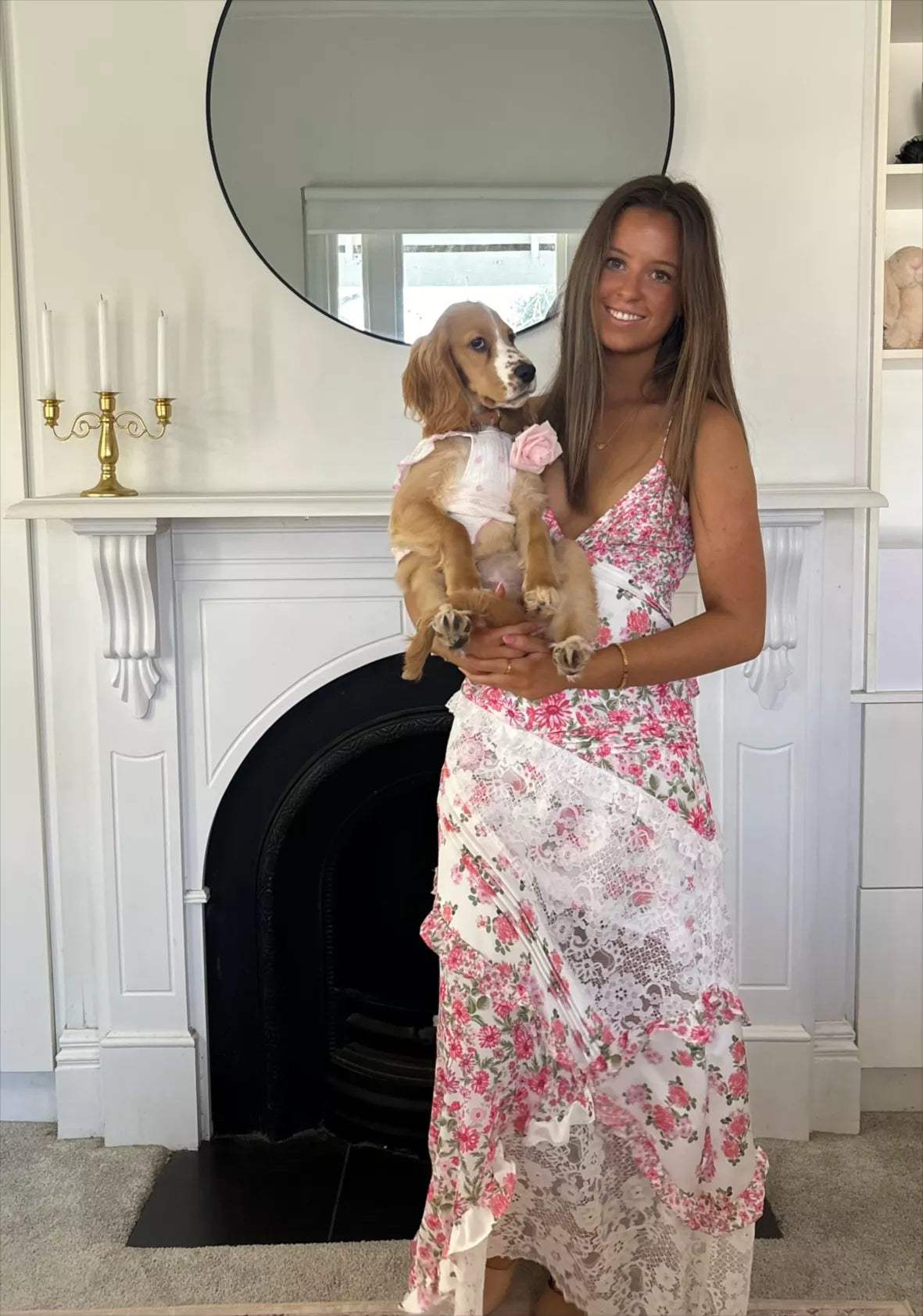 Dreamy asymmetrical patchwork garden and carnationprintmaxidress featuring a plunging neckline, freshwhiteflorallacepaneling, and feminine pin-tucked andruffledetailing throughout. Partially lined, delicate shoulder ties.