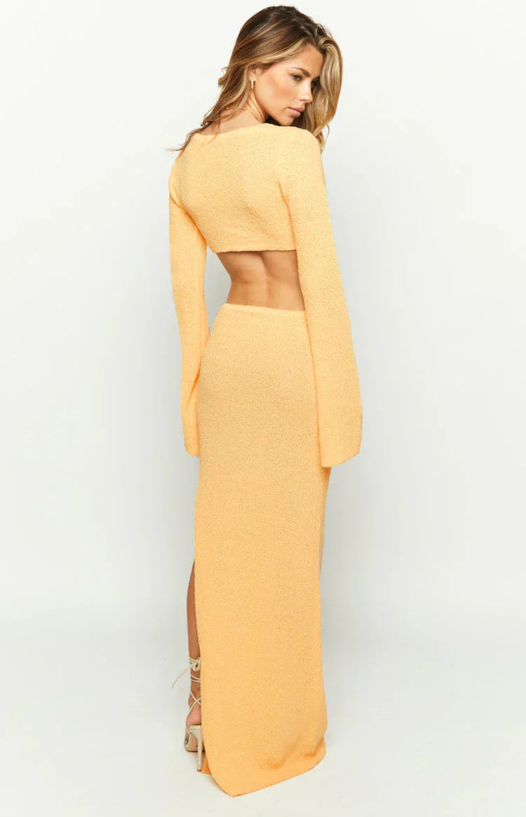 Statement features: With its waist and back cut out, flared sleeves, and side leg split.